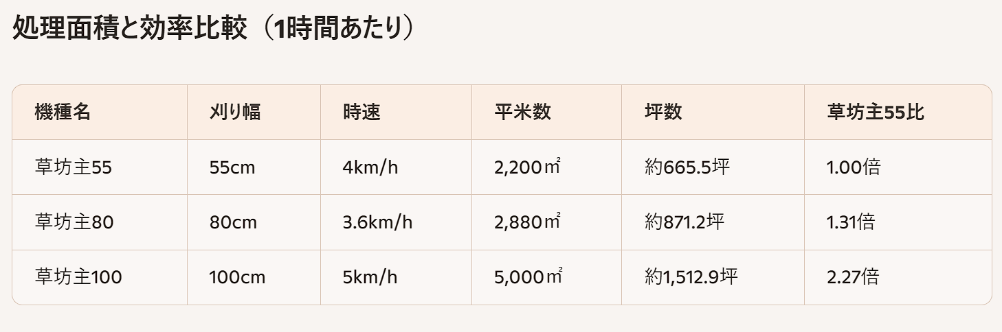 *平坦な場合の理論値ですので実際の草刈では地形や草の状態により効率が下がります。